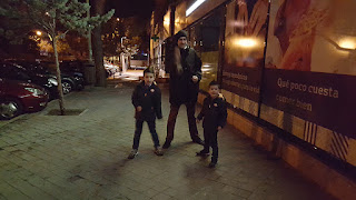 Nada más llegar saludaron a las abuelas, pusieron la casa del reves con sus saltos de alegría y decidimos bajarlos a tirar las bombetas a un parque cercano. Tenían orden de no estallarlas cuando hubieran perros y bebés cerca. Respetaron la regla bastante bien, aunque se despistaron con un perrito, que no pareció muy afectado por los revoltosos infantes que tiraban bombetas a los pies de sus papás al grito de "baila forastero jajaja". Resultado: Castigados sin tirar los petarditos durante cinco minutos.