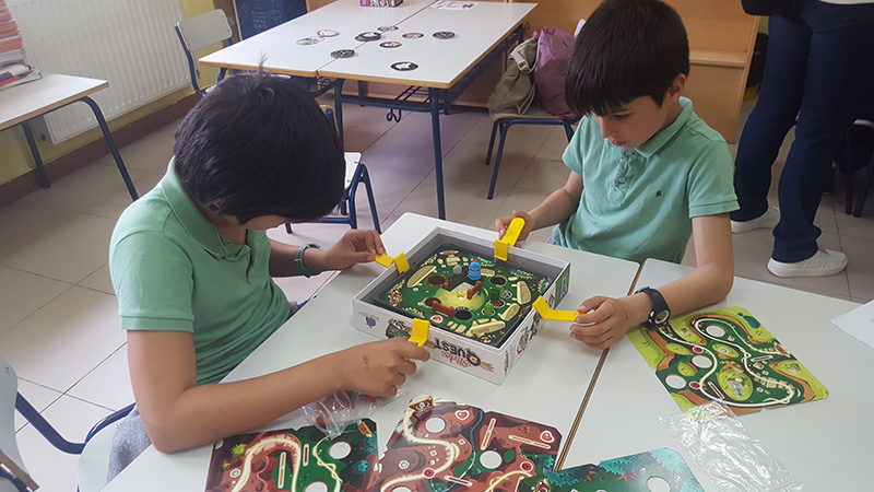 Poco después, estábamos intentando cumplir las misiones de Slide Quest guiando al caballero manipulando unas palancas que mueven el tablero y hace que las figuras se muevan. ¡Cuidado con los agujeros! A mis hijos les hace mucha gracia este tipo de juegos, aunque no controlan muy bien los temas psicomotrices y suelen acabar peleados. Esta vez no fue una excepción. El juego es de 1 a 4 jugadores y está recomendado a partir de 7 años.